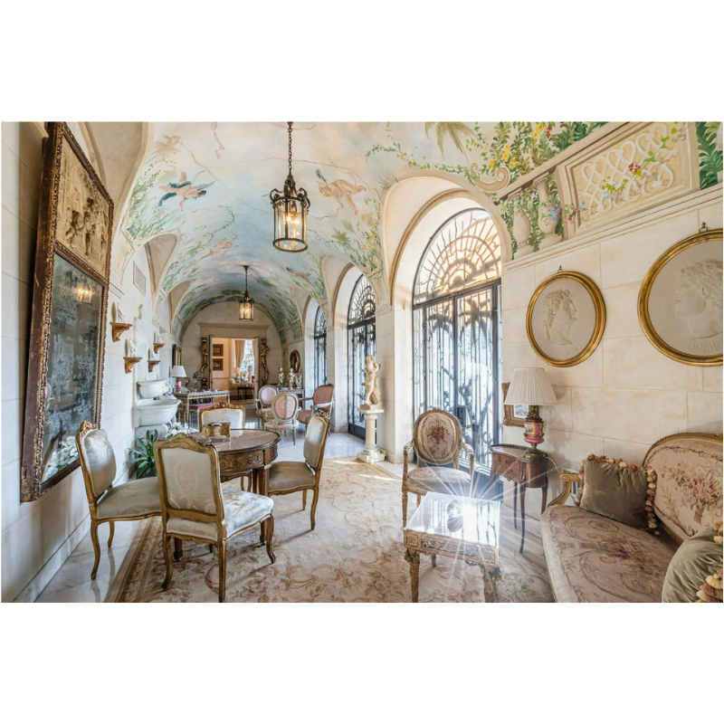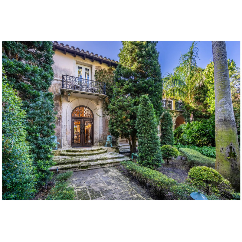 A 1930s Mediterranean Revival estate overlooking Biscayne Bay, it was originally built for a President of General Motors and then acquired in the late 1990s by the current owners Loren and J.R. Ridinger. The couple are the founders of Market America—a revolutionary product brokerage and internet marketing company—while Loren is also a well-known fashion, beauty, and business leader recognized by Vogue, Haute Living, and Forbes magazines. Using historical photos of the estate, the couple acquired period furniture, art, and decorative objects to help realize their vision of contemporary life in a historic setting.